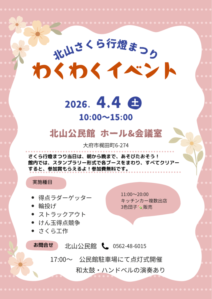 駐車場敷地内にて、大府大和共栄保育園、アスク共和東保育園、至学館大学附属幼稚園や北山小学校など、地域のこどもたちが描いた行燈の絵をしだれ桜の下に設置し、夜桜と一緒に楽しみます。